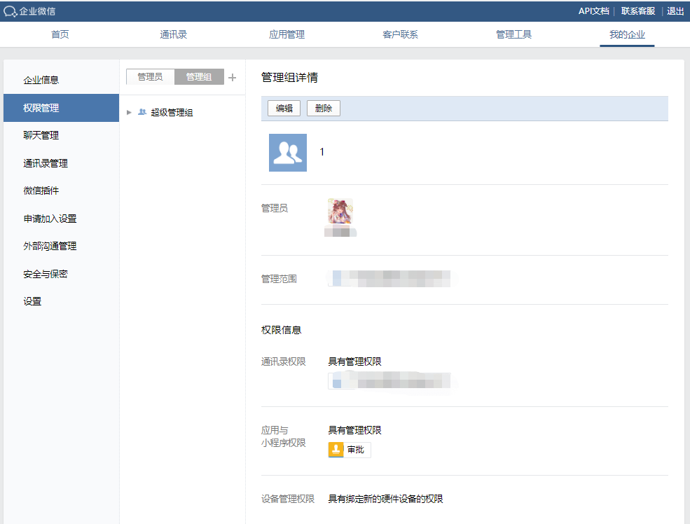 超级管理员具有所有管理权限,管理范围是整个企业,具有通讯录及应用的配置等全部管理权限。