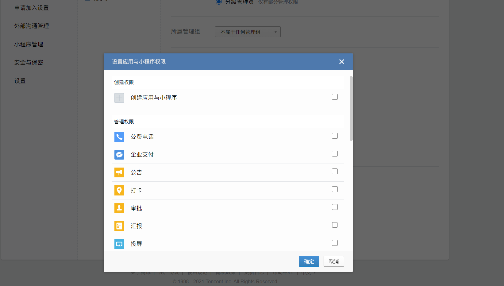 分级管理员的权限要小很多,只能管理某个部门,或者具备某些应用的管理权限。