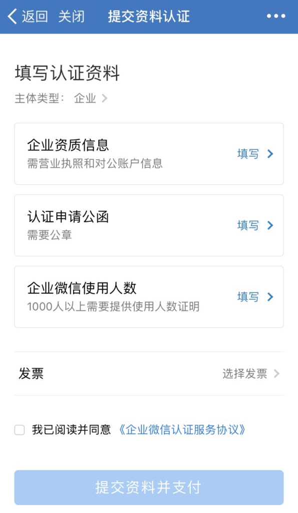 如果微信公众号已经认证,且和企业微信主体一致,那么可以使用这种快捷方式认证,当然一个公众号只能给一个企业微信认证,无需认证费。