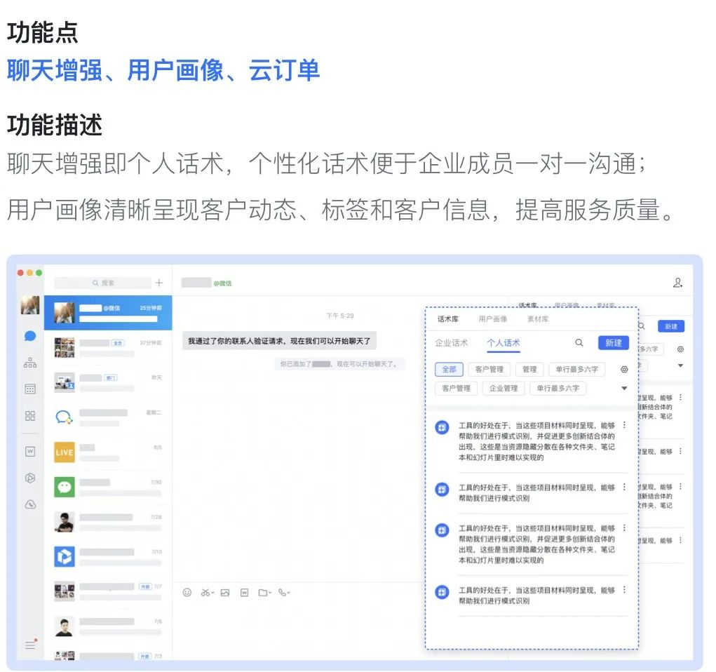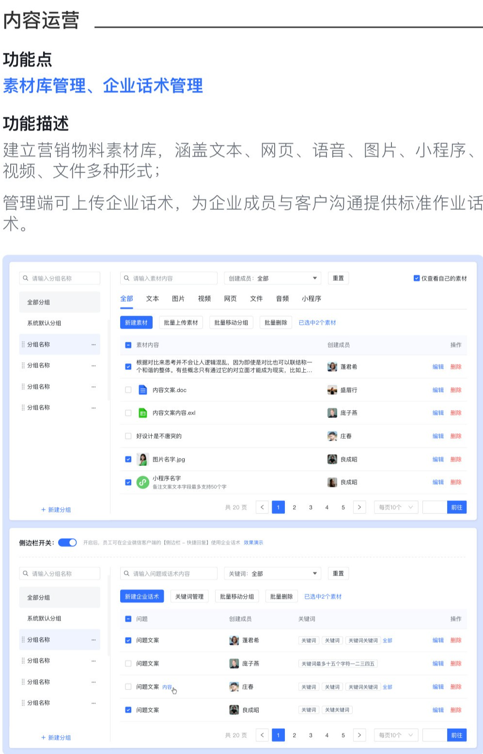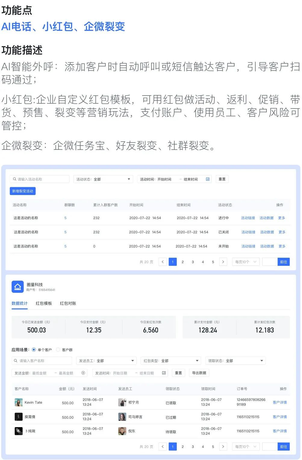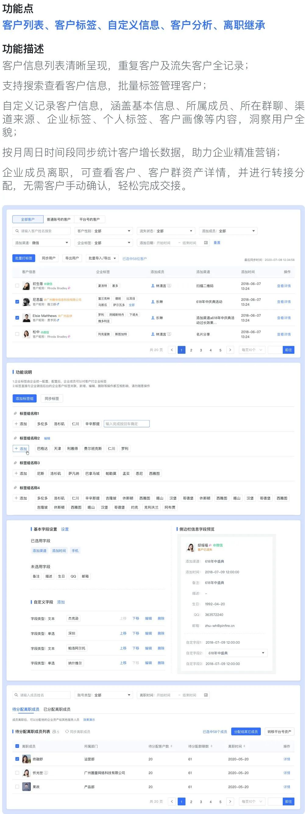 基于客户增长及流失数据,为运营人提供KPI考核维度;活动营销的分类人群群发触达、批量打标签、邀请同类客户进群等;离职员工的客户资产转接,员工离职客户带不走。