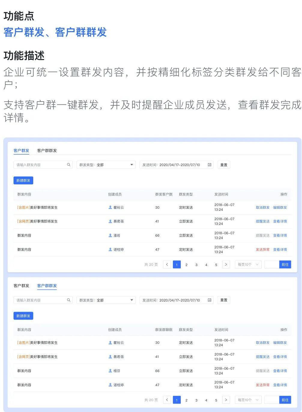1.标签精准化群发,提高营销精准度、内容专业度,高效触达;2.了解群发任务完成情况与发送详情,及时推动信息发布,提高运营效率。