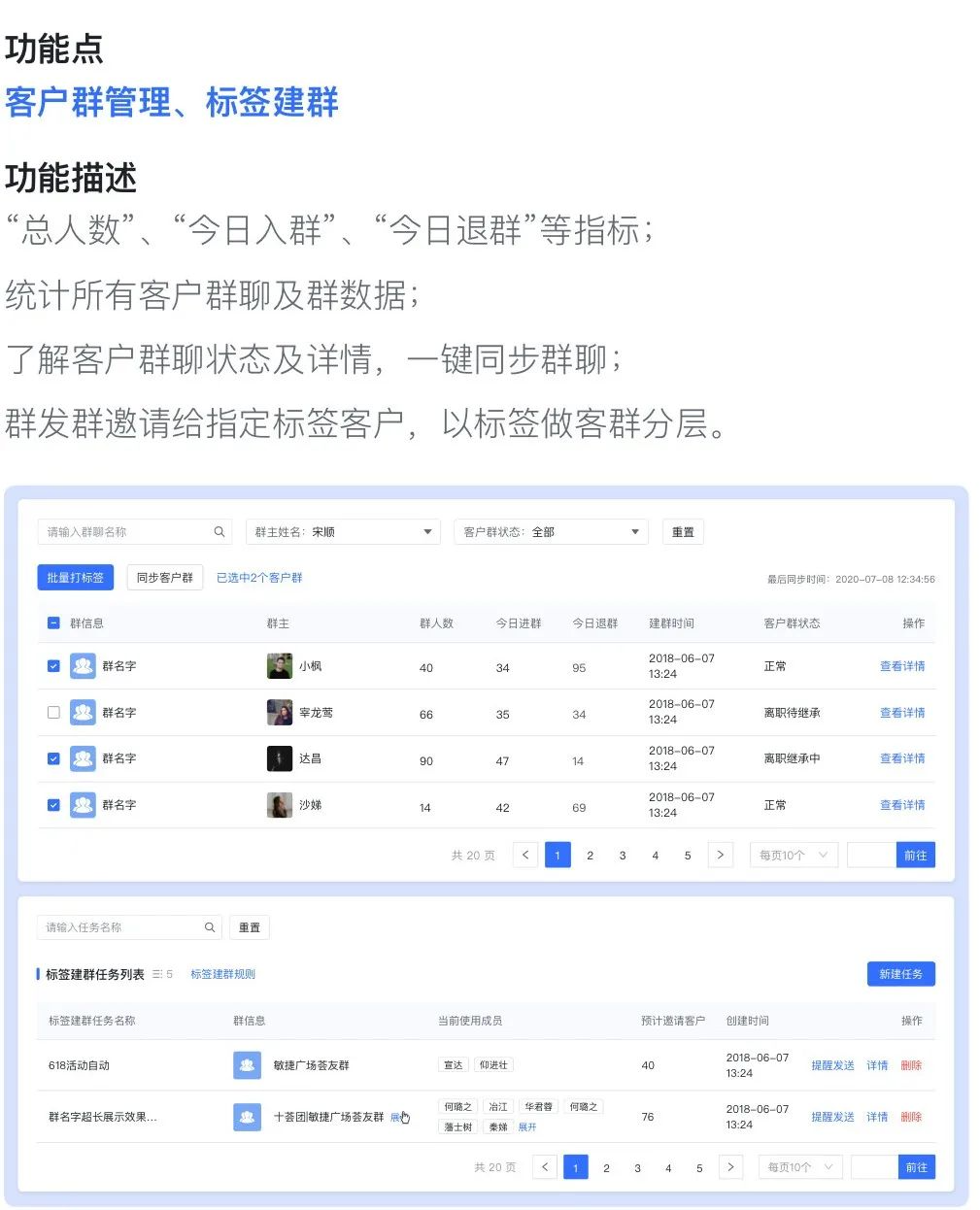 1.直观展示企业客户群数据、客户群详情及群成员信息,方便企业管理;2. 通过标签精准划分客户,统一引导加入企业微信群,实现精准分层。