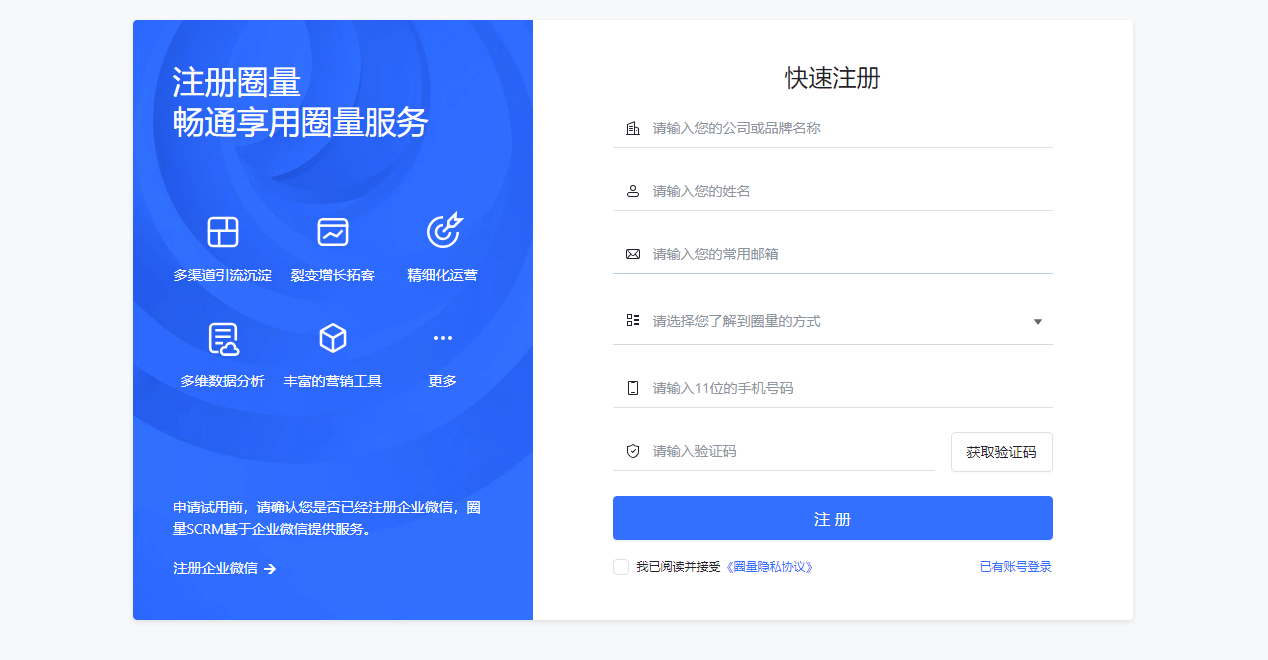 很多想要申请注册圈量SCRM的小伙伴们对于注册流程不是特别的了解,跟着小编一起来看看详细注册步骤有哪些吧!