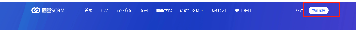 第一步:登录圈量SCRM官网,导航栏右边有一个【申请试用】,直接点击进去;