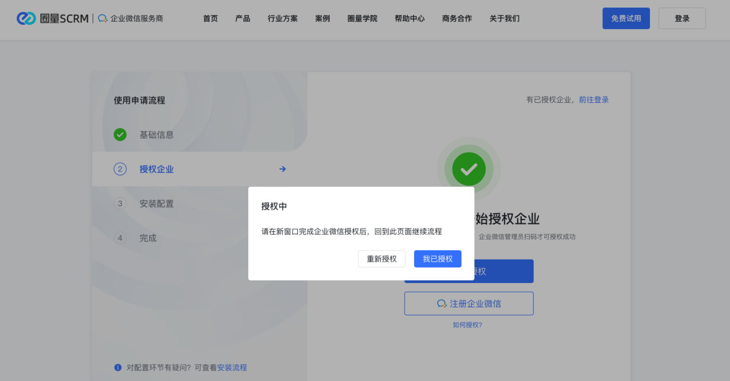 进去圈量SCRM官网,填写完相关的信息之后就勾选同意,然后点击注册。注册成功之后就可以授权【圈量助手】,点击授权就会跳到授权页面;