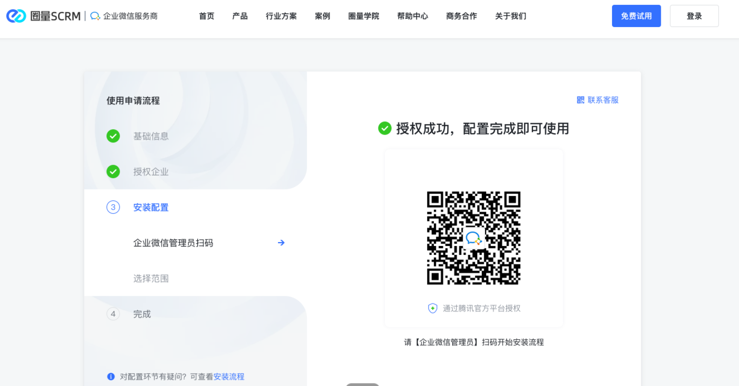 第四步:完成授权之后,就可以在企业微信安装圈量SCRM应用,使用企微的管理员账号或者之前绑定的个微账号扫码授权安装;若是使用个微授权安装的话,个微必须要绑定企业主体,否则是不能完成安装的。