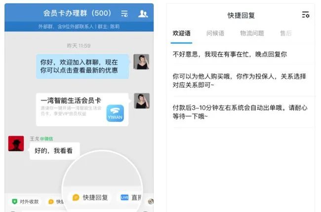 此外,企微还支持快捷回复,相当于生成了一个客服模块。以往用个微,除非是接入第三方工具,否则就无法快速回复。但是企微在手机端就可以设置日常回复,针对一些常见的问题,能够快速地回复客户。