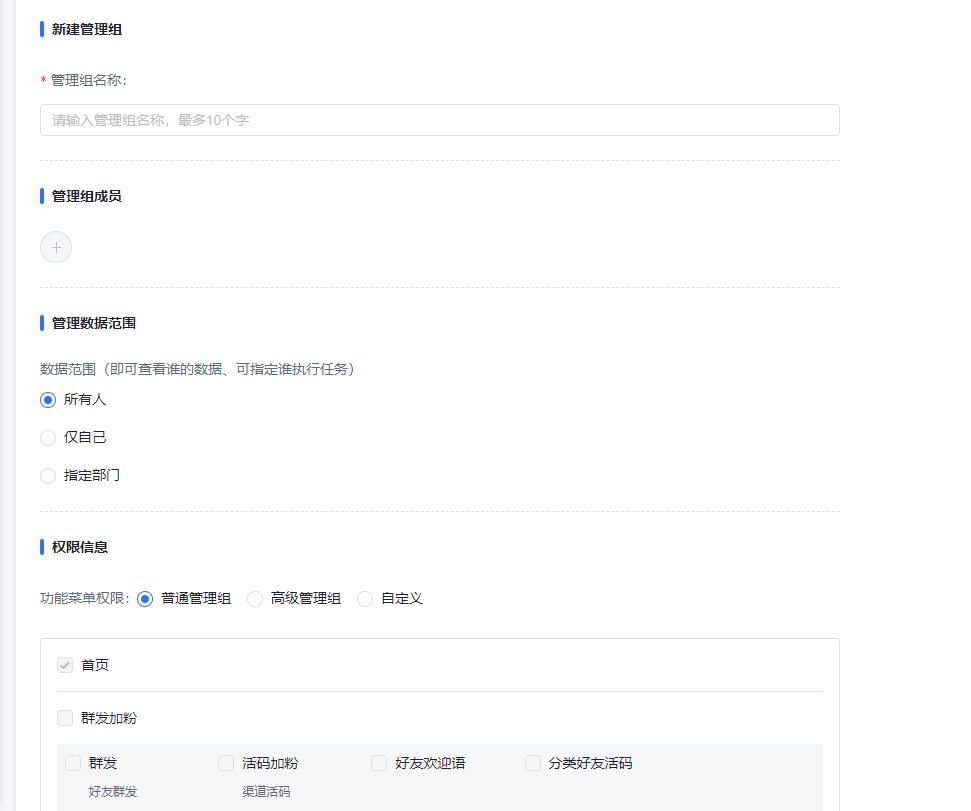 4、创建的管理组可以分为普通管理组跟超级管理组,超级管理组内的成员拥有圈量所有功能权限以及数据查看权限;