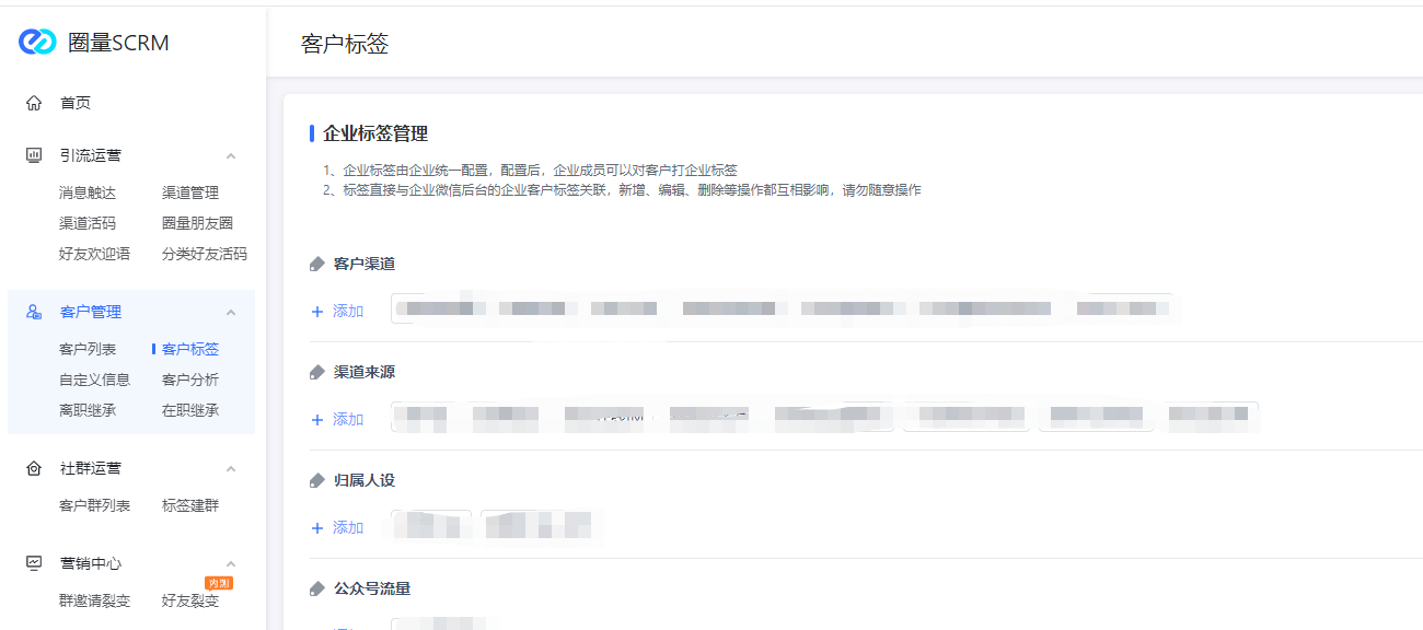 圈量SCRM可以通过渠道活码功能实现对不同渠道的客户快捷打上对应标签,以便对引流客户进行精细化运营。