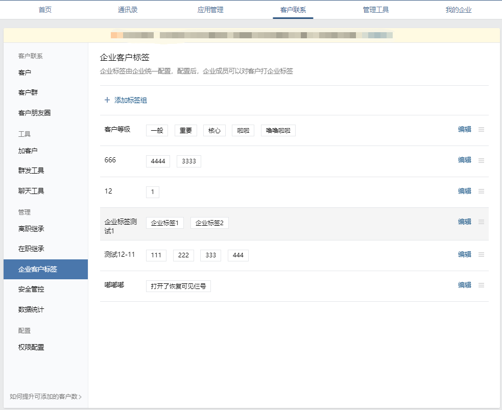使用企业微信管理员账号登录后台,点击客户联系——企业客户标签;在后台设置完相应的标签之后,就可以在跟客户聊天的时候根据客户行业,打上企业标签。同时在与客户聊天过程中,根据需求不同,企业成员可以自定义添加个人标签,并且给客户打上个人标签。