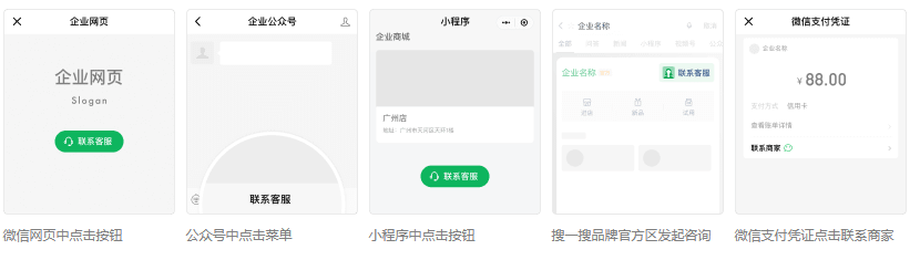 微信客服,并不局限于微信。微信内部开放了企业视频号、公众号菜单栏、公众号文章、搜一搜品牌官方区、小程序这些常见入口,甚至开放了支付凭证。微信私域的各个营销、成交端口都能快速接通客服,触达能力再次升级。