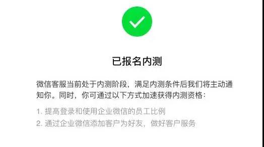 目前,微信客服功能还处于内测阶段,申请者需要开通企业微信,提交申请,进入内测审核环节。有两种方式可以加速获得内测资格:1、提高登录和使用企业微信的员工比例;2、通过企业微信添加客户为好友。