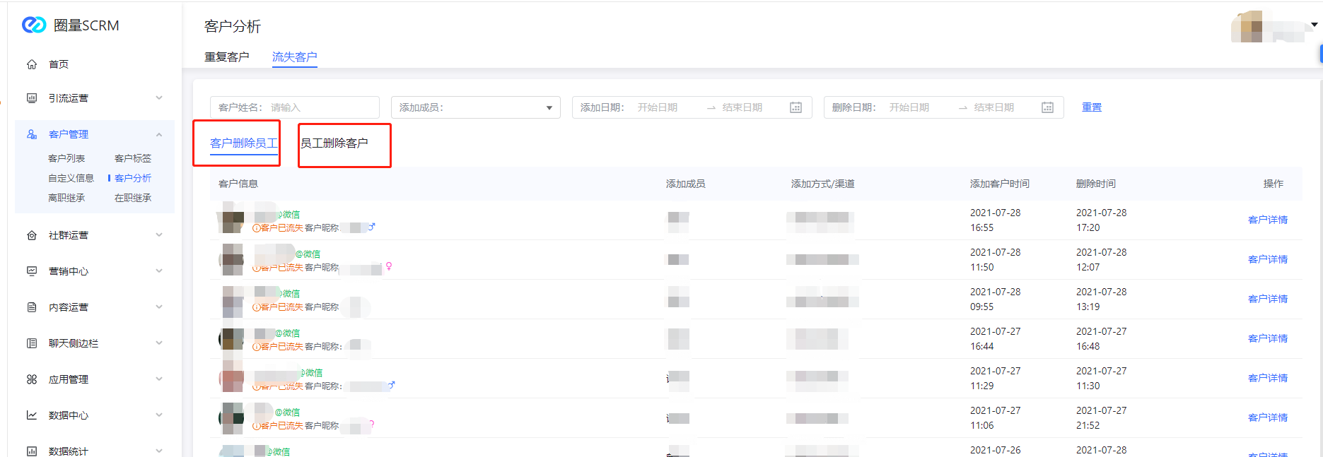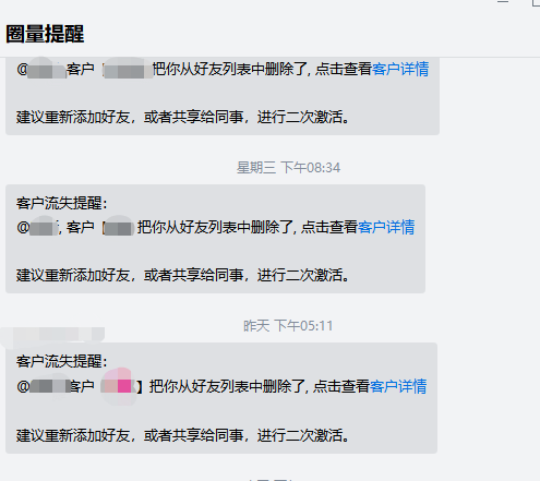 圈量SCRM在客户删除企业成员的微信时,企业成员就会收到被好友删除的提醒。管理员也可以在圈量后台中看到流失客户的详情。除了能看到客户删除员工的情形,还能看到员工删除客户的详细情况,帮助企业提升客户资源管理水平。