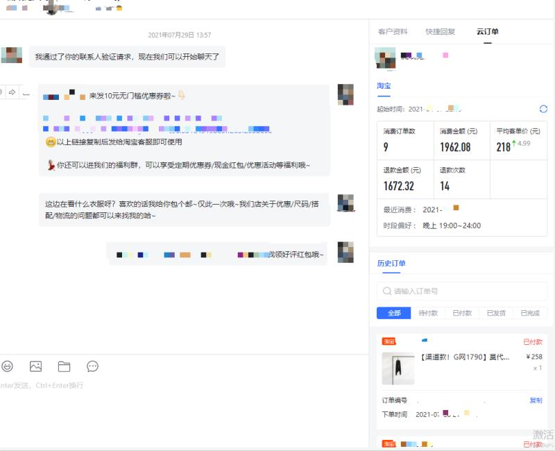云订单功能,企业成员可在聊天侧边栏中使用云订单功能。云订单功能通过接入第三方购物平台的开放API来实现订单数据的同步。使用云订单侧边栏,在聊天过程中,员工可以查看客户在企业店铺中的消费数据以及历史订单。可以使用到跟进记录功能,帮助员工详细记录客户信息,重要信息可以随时记录进去,帮助员工更好的判断客户意向,掌握更多的精准运营客户。
