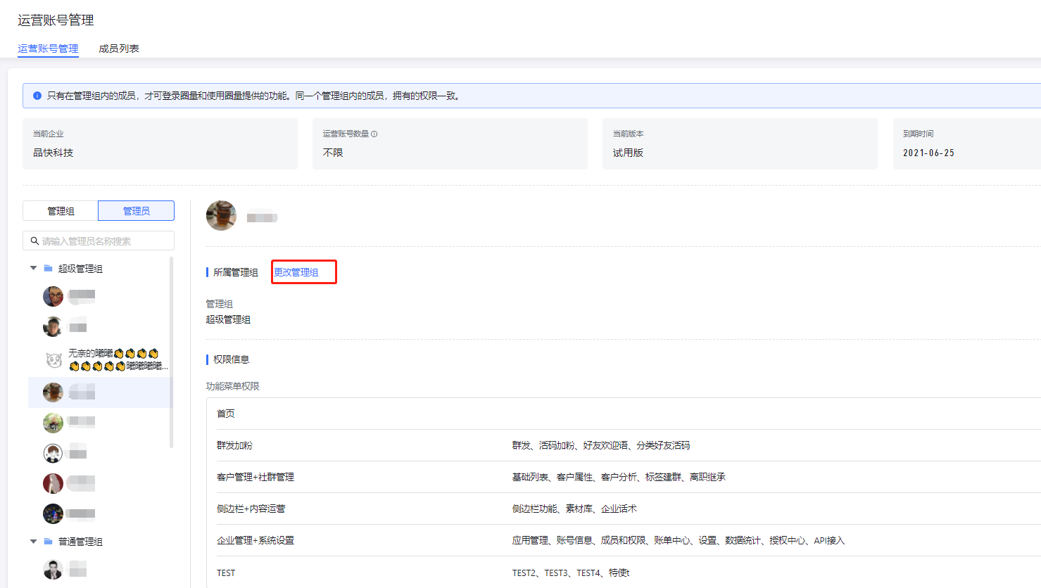 首先企业需要创建管理组,然后将企业成员添加到组内,然后被添加账号成了运营账号,就可以使用圈量后台还有圈量SCRM的相关功能;