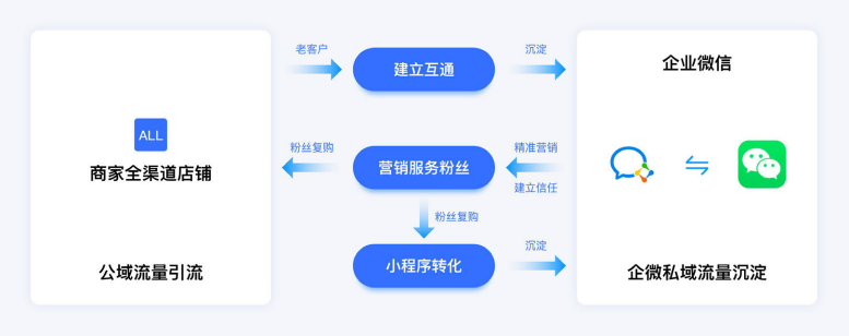 企业微信与微信进行互通,背靠微信十二亿用户流量,帮助企业通过企微沉淀私域流量用户。