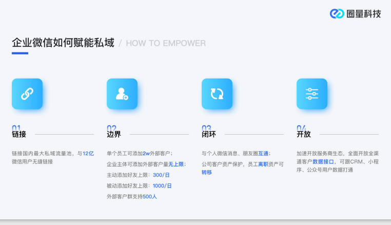 私域流量是属于企业自己的,能够自主掌控的免费流量,可以在任何时间任何频次都能触达得到的用户的渠道。现在很多人都在搭建企业的私域流量池,下面跟着圈圈一起来看一下企业微信是怎么帮助企业搭建私域流量池的呢?