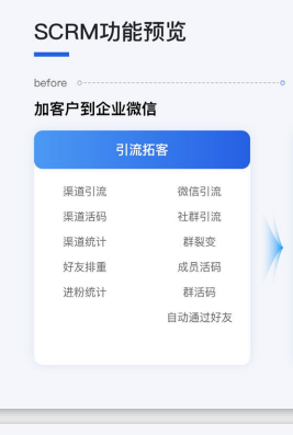 圈量SCRM主要功能有:渠道活码、手机号加好友、社群运营、内容运营、智能营销等,能够帮助企业精细化运营客户,更好的进行企业微信营销。扫一扫下方二维码,可以免费试用圈量SCRM哦!