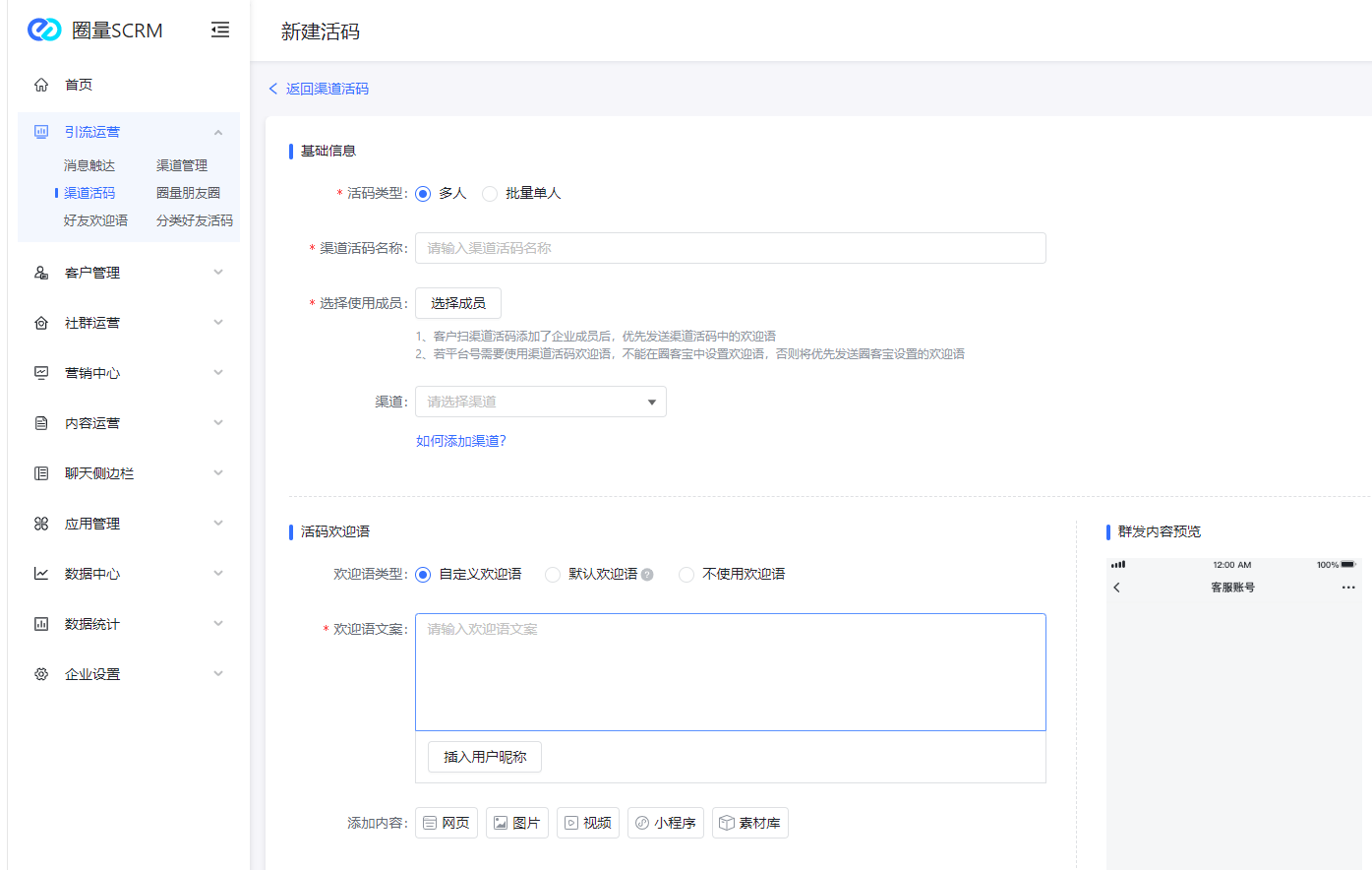 登录圈量SCRM后台,点击引流运营——渠道活码——新增活码;填写完相关信息保存,渠道活码就添加好啦,在进行企业微信营销时,将活码下载下来放到对应的渠道即可。对于已经创建的不同渠道的活码,还可以进行编辑和管理哦。