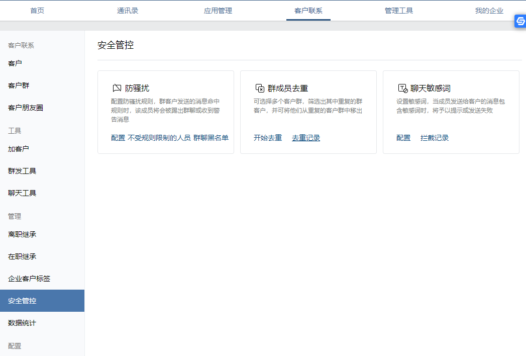管理员账号登录企业微信后台,进入客户联系——安全管控——防骚扰,然后点击配置,就可以配置防骚扰规则,群聊中客户发送的消息命中规则时,就会被提出群聊或者收到警告消息;