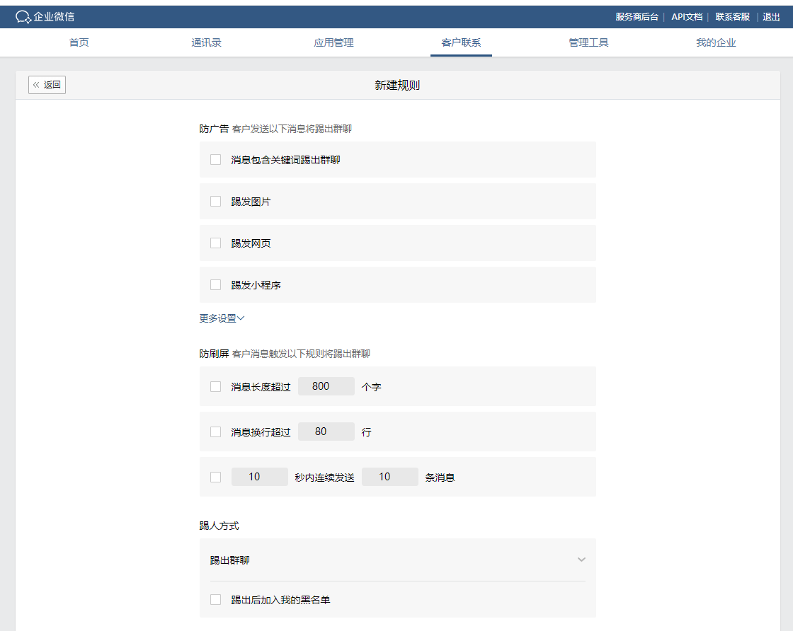 企业微信配置防骚扰规则,群聊中客户发送的消息命中规则时,就会被提出群聊或者收到警告消息;