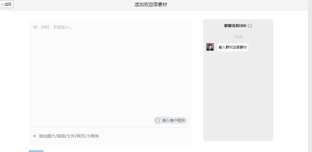 入群欢迎语功能群主可在群聊中选择并配置,客户进入群聊后,将收到入群欢迎语,可以选择间隔一定的时间段发送一次,还支持插入客户昵称。