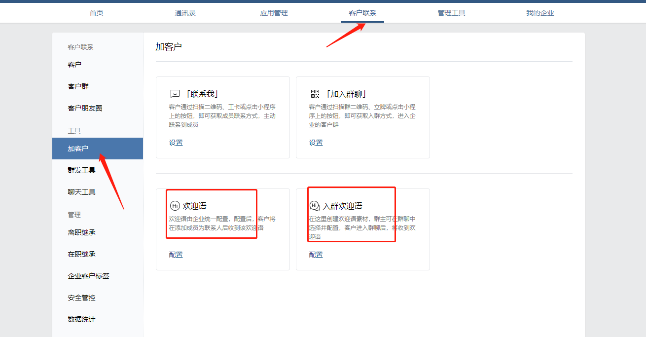 企业微信管理员账号登录后台中,然后点击客户联系——加客户——就可以选择配置欢迎语和入群欢迎语了。