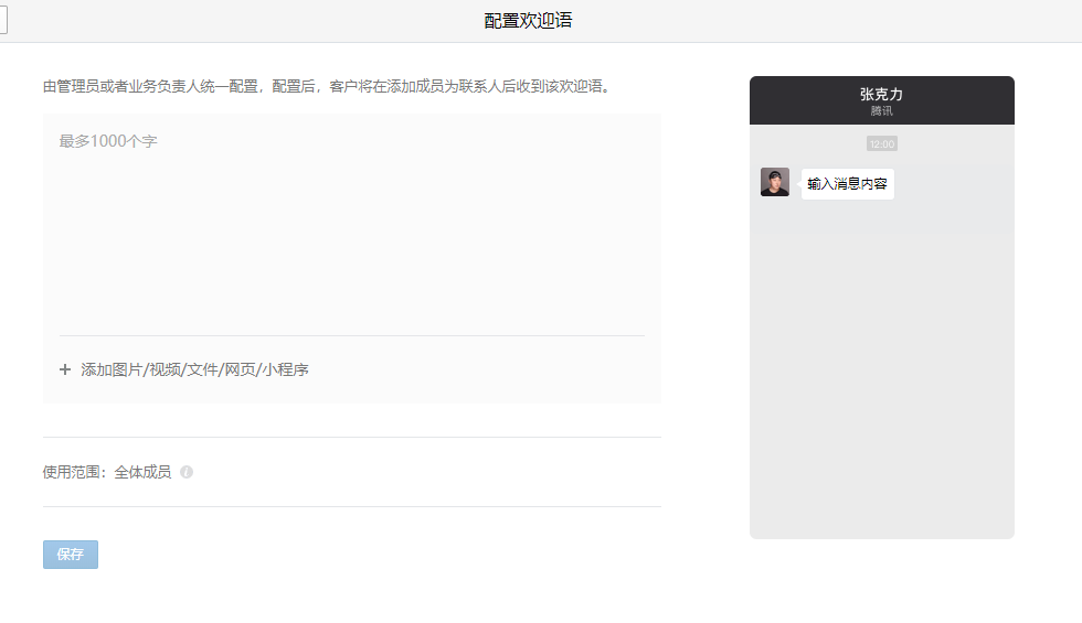 好友欢迎语功能由管理员或者业务负责人统一配置,配置后,客户将在添加成员为联系人后收到该欢迎语。除了文字,还可以添加图片、视频、文件、网站、小程序等内容。