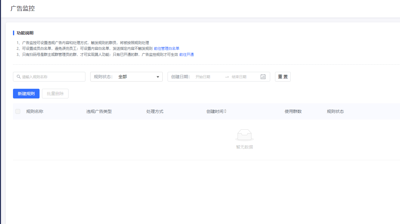 设置防骚扰的规则:关键词、长图、长文字等形式,群成员一旦试图在群里发广告骚扰性质的内容都会被自动拦截。若是在群聊中出现添加微信、加好友等关键词,如果群内有成员发送消息触及了关键词,系统会警告该成员不要发违规消息,再发送的话会被踢出群聊,在一定程度上防止有人在社群内添加好友。