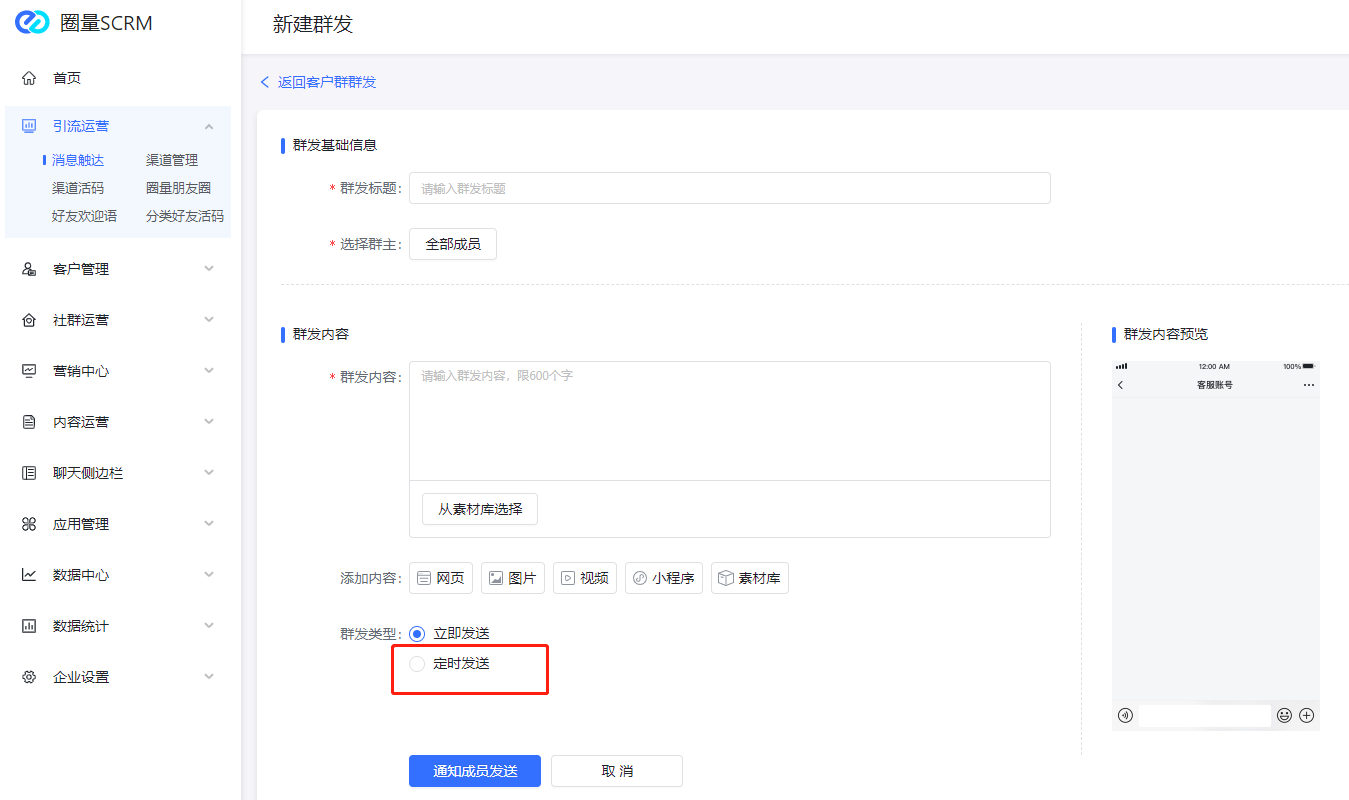 登录圈量SCRM的后台页面中,进入引流运营——消息触达——可以选择客户群发或者客户群群发——新建群发——然后编辑群发标题,选择需要群发的成员,编制群发消息内容,还可以添加网页、视频、图片、小程序、素材库等内容,然后选择定时发布即可。