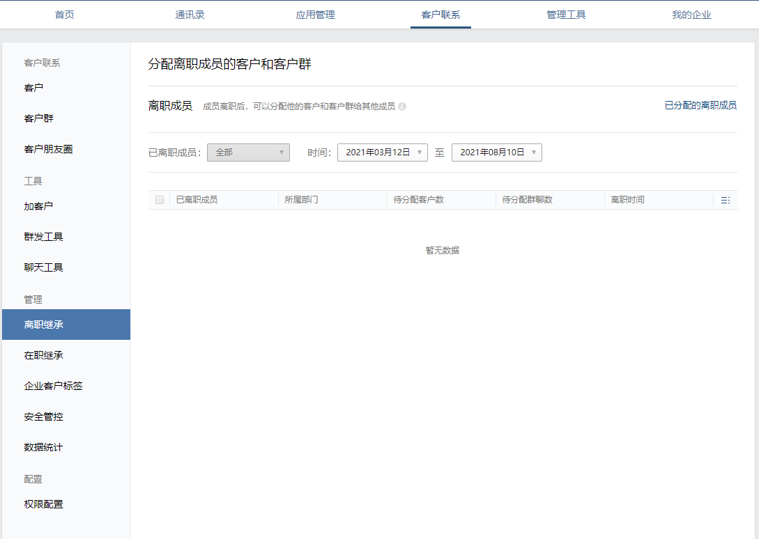 离职继承功能能够让企业的客户留存到企业微信中,员工离职也是无法带走的,当员工离职之后,可以将客户与微信群分配给企业其他成员。