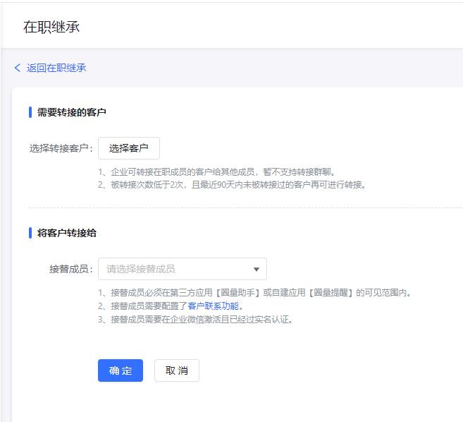 除了客户共享功能,圈量SCRM还支持在职继承功能,企业可以转接在职成员的客户给其他成员,暂不支持转接群聊。被转接次数低于2次,且最近90天内未被转接过的客户再可进行转接。