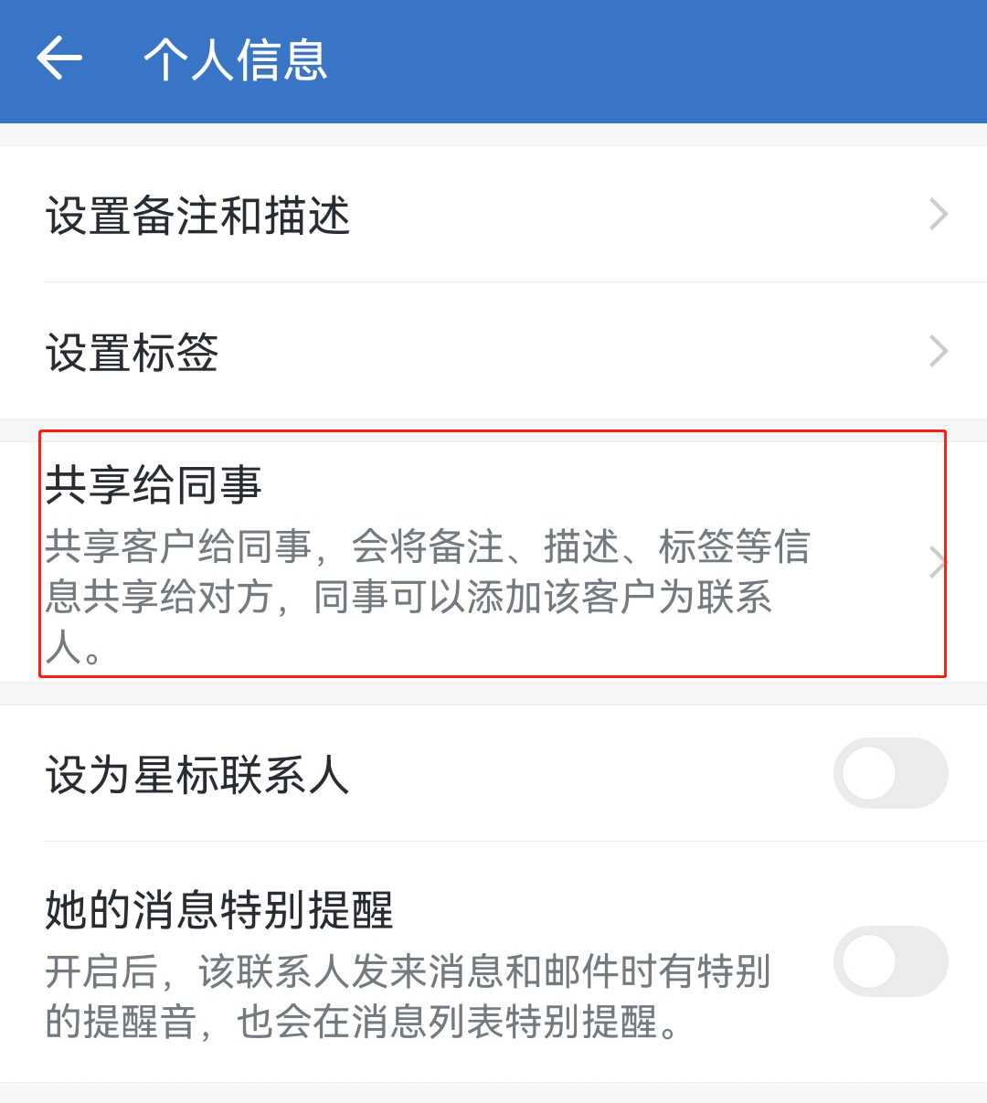 点击客户头像,查看客户信息,然后点击右边三点的进入个人信息中,就可以看到共享给同事这一功能,就可以将客户共享给企业其他成员;