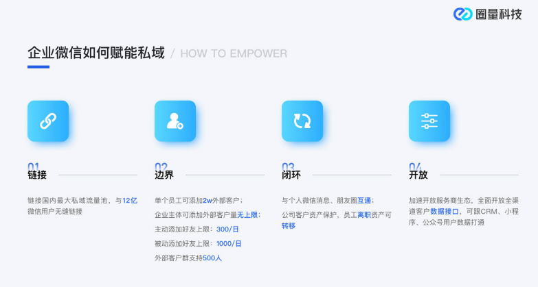 圈量SCRM的主要功能有:引流运营、社群运营、客户管理,用户画像、智能营销、聊天侧边栏、内容运营等功能,帮助企业精细化管理客户,更好进行企业微信营销。