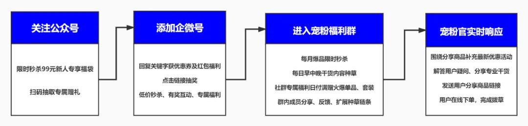 基于用户的深耕细分,通过活动推送精准触达用户,转化成交;在此基础上,宠粉官针对犹豫客户提供专业答疑解问,引导成交。培养成交用户分享意识,真实用户发出产品,带动话题讨论,扩展种草链路,吸引更多用户持续拔草。