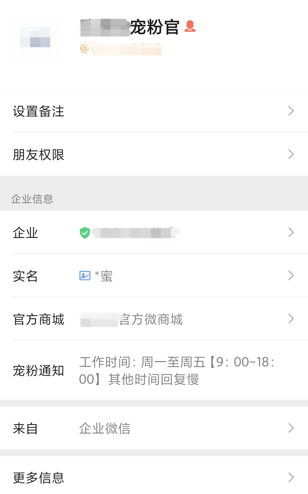 对外展示内容:统一昵称、企业、实名、官方商城(品牌官方微商城)、宠粉通知(工作时间)