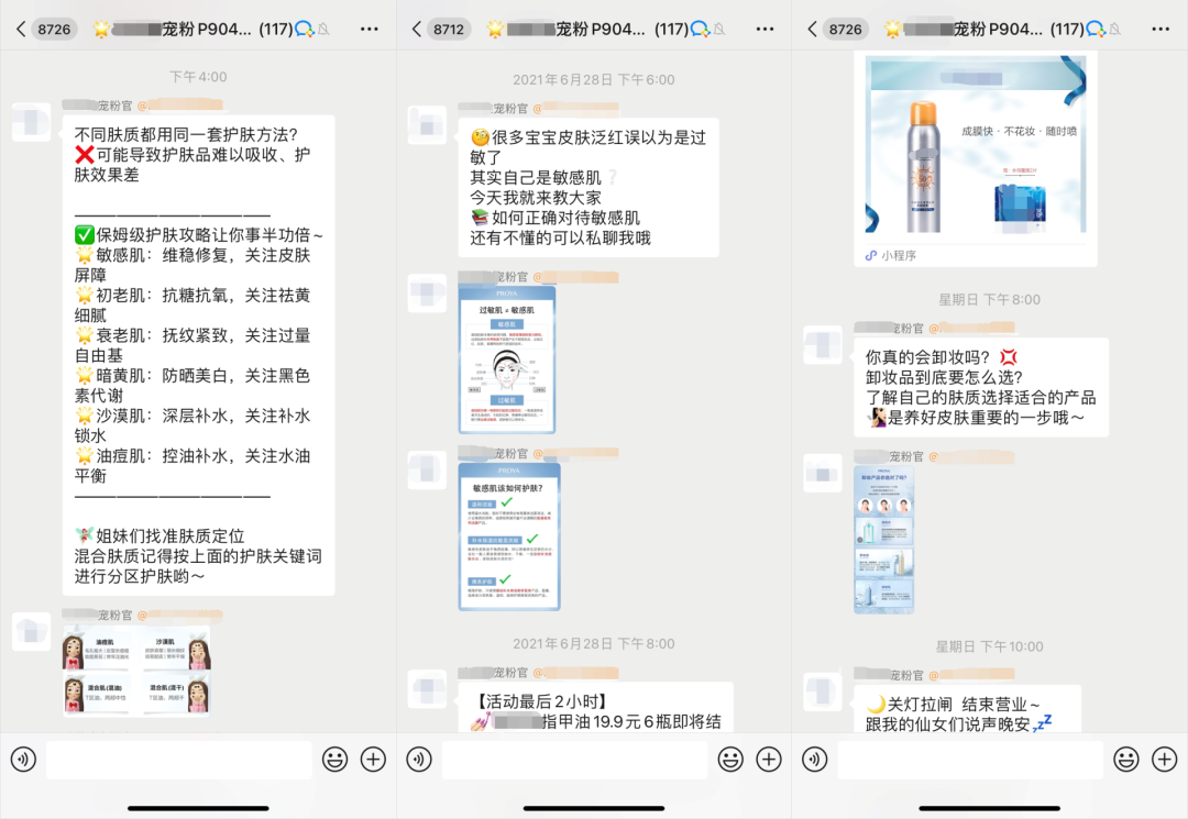 针对不同渠道引流的用户引导添加到对应的企业微信号,并邀请进群,群内主要围绕产品、护肤知识等进行内容输出。