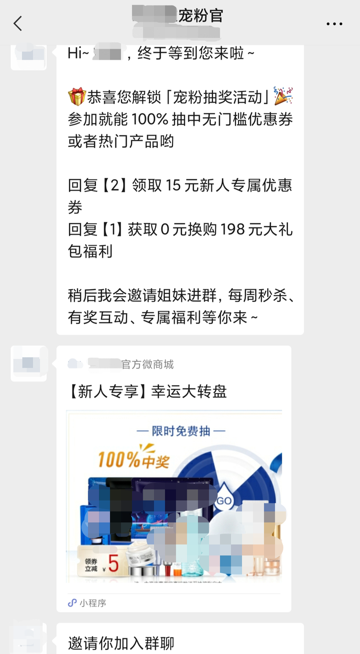添加品牌宠粉官后自动发送欢迎语,欢迎语内容包括专属福利的领取+抽奖链接+入群邀请链接。用户只要回复关键词领取礼品、点击链接抽奖,进群即可。