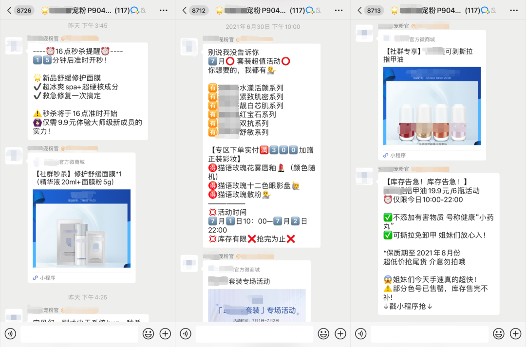 不定期推出社群优惠活动,例如秒杀、满减/满赠、单品折扣等活动,活动提前一天或当天预热,到点开抢,不间断播告活动库存或活动剩余时间,营造商品抢购紧张氛围,促使用户下单决策,完成从商品种草到拔草的最终环节,同时提升商品销售量。
