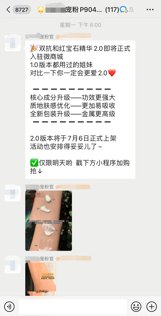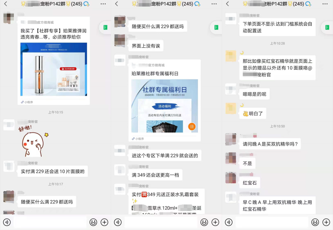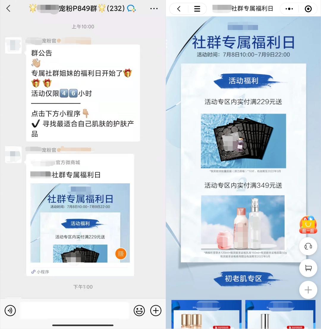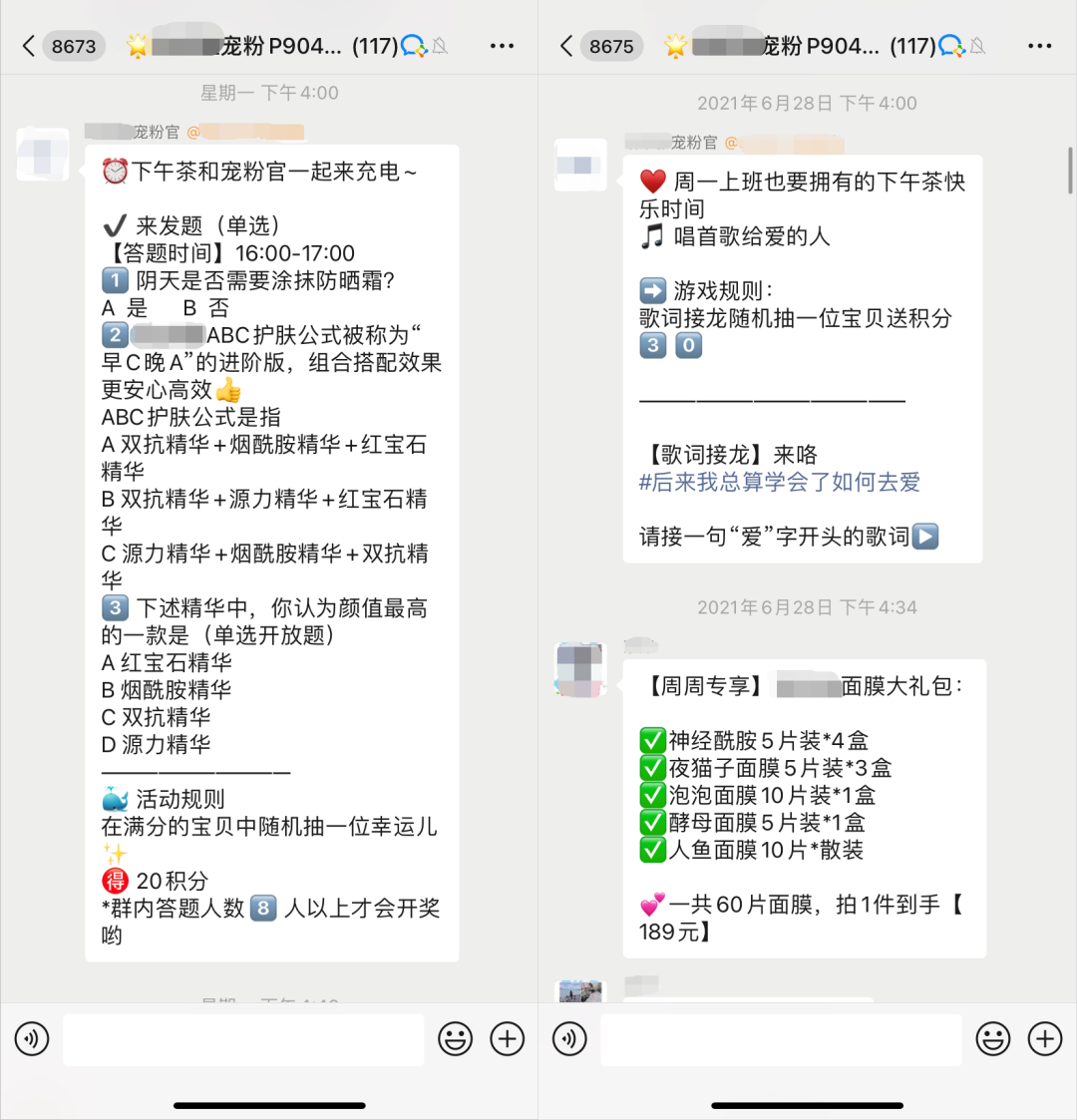 日常进行护肤秘籍、护肤Q&A等干货内容分享,让用户感受到社群存在价值,提升社群用户留存率,同时分享的干货内容,又与即将上线的产品强关联,在商品上前完成种草用户前的准备工作。