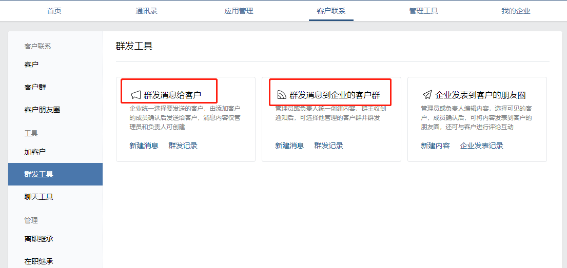 管理员账号登录企业微信后台,点击进入客户联系——群发工具,然后选择群发消息给客户或者群发消息到企业的客户群。