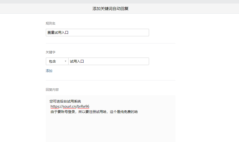 但是群聊小助手只支持在群聊中根据关键词自动回复消息,进行企业微信营销时,当客户比较多时,就无法实现实时回复,无法及时跟进客户,给客户的体验感不是特别的好。这时候可以借助第三方企业微信服务商——圈量SCRM的私聊自动回复功能,帮助销售人员及时响应客户的问题。