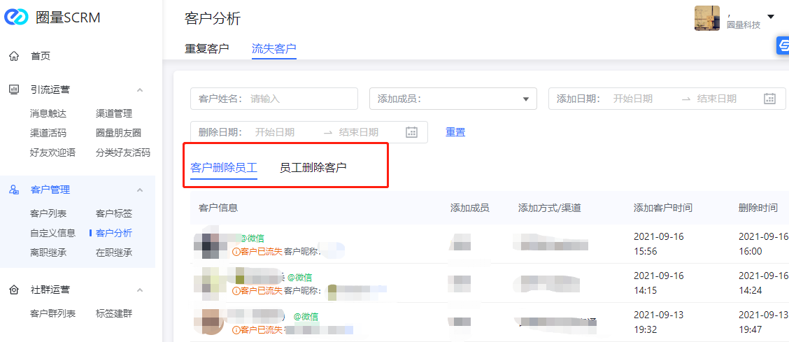 同时,圈量SCRM还有客户分析功能,可查看企业客户资源详情,支持分析重复客户与流失客户,关于流失客户统计可以分为客户删除员工和员工删除客户情况,便于企业统计和分析客户流失原因。能够提升企业客户资源管理效率,为营销策略的调整提供参考。