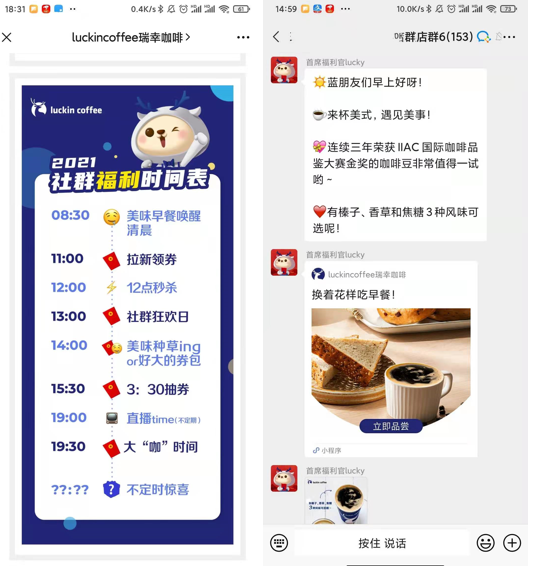 ③定期抽奖:抽奖数次限时限量,每天都有机会领取不一样的咖啡,这样能让用户时刻关注本群,大幅度提高用户活跃度。