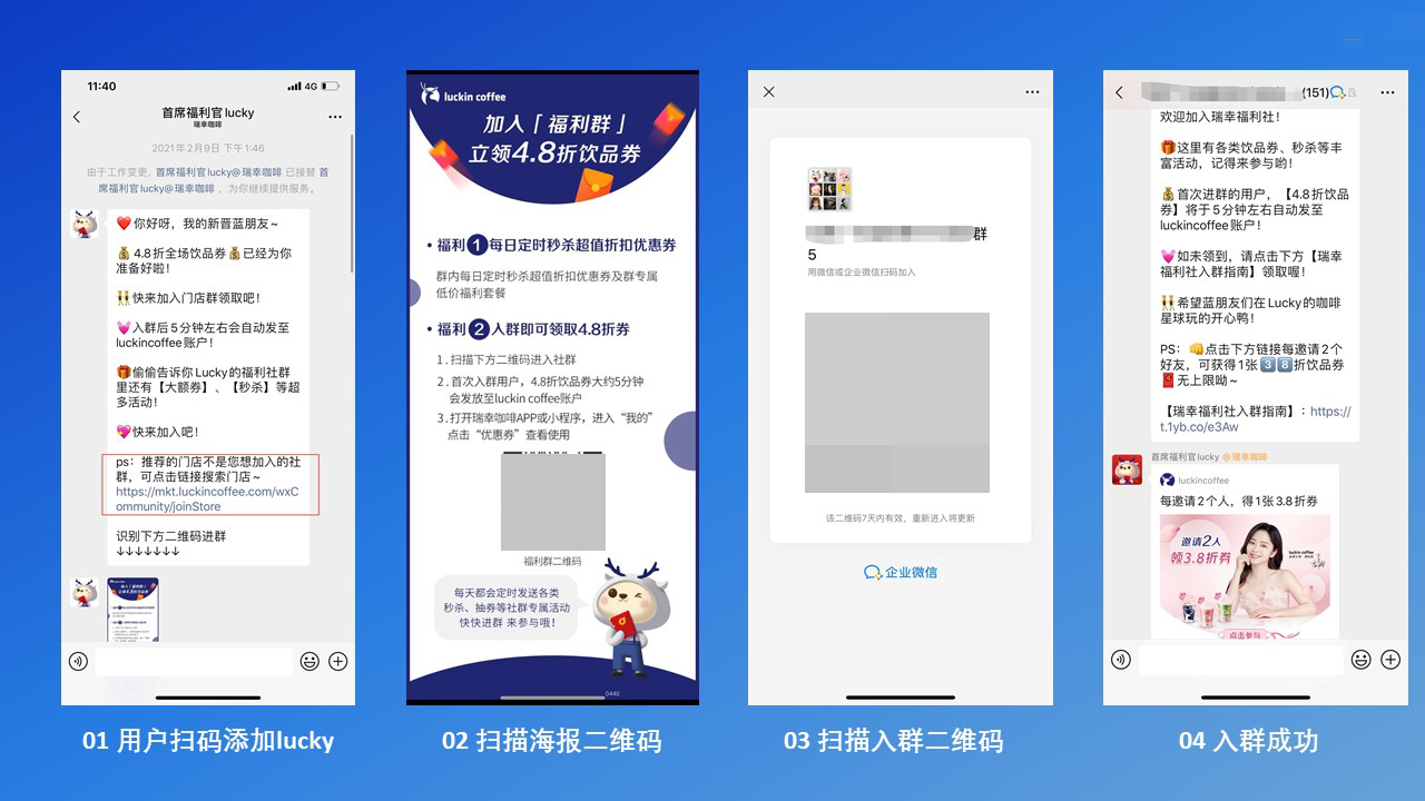 在瑞幸小程序中心首页和个人中心上,点击icon或者banner会直接显示折扣的信息,从而能引诱消费者进入引流页。当消费者可以在引流页看到一段文案和二维码,然后消费者按照文案的要求来做就可以添加瑞幸运营人员的企业微信从而得到产品福利。一番操作下来,消费者就会被瑞幸的运营人员拉入私域群中获得产品福利。