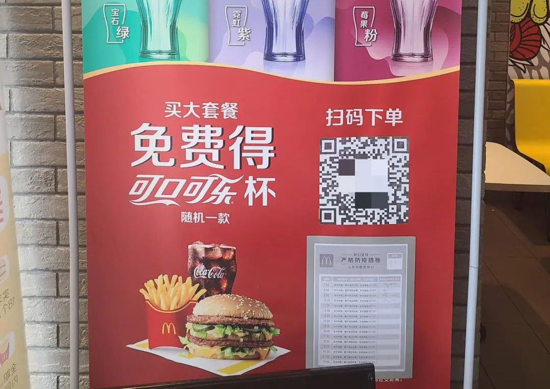 当消费者进入店铺时,店铺的大门和进店门旁边的位置是他们第一眼看到的地方。因此,这两个地方都能够做为我们引流的点。举个实际例子,有天我去麦当劳消费时,在我刚进门的时候就看到了一张海报张贴在玻璃门上,在上面可以看到“9.9元享受6折特惠,一次回本,多用多省”这样的字眼,他们以这为噱头来吸引消费者,让他们通过扫描二维码去进入到微信的小程序里面。而在进门之后,又可以看到一个易拉宝放置在在大门的旁边,来让消费者知道在近期会有一个活动是跟可口可乐联名所做的——“买大套餐,免费得可口可乐杯1个”,他们用这来吸引用户去下载APP。