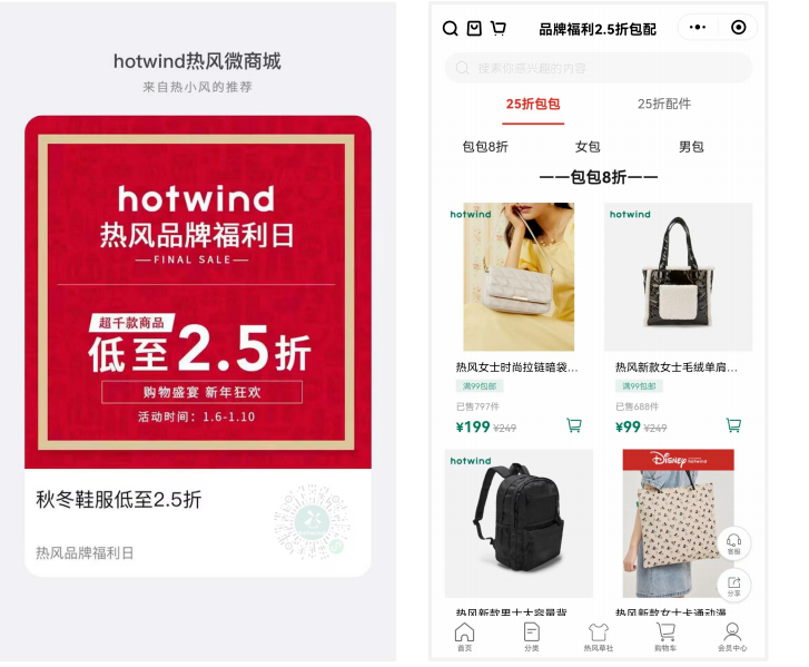 热风每个季度固定时间举办“品牌福利日”活动,以3-8折利益点吸引用户参加活动。