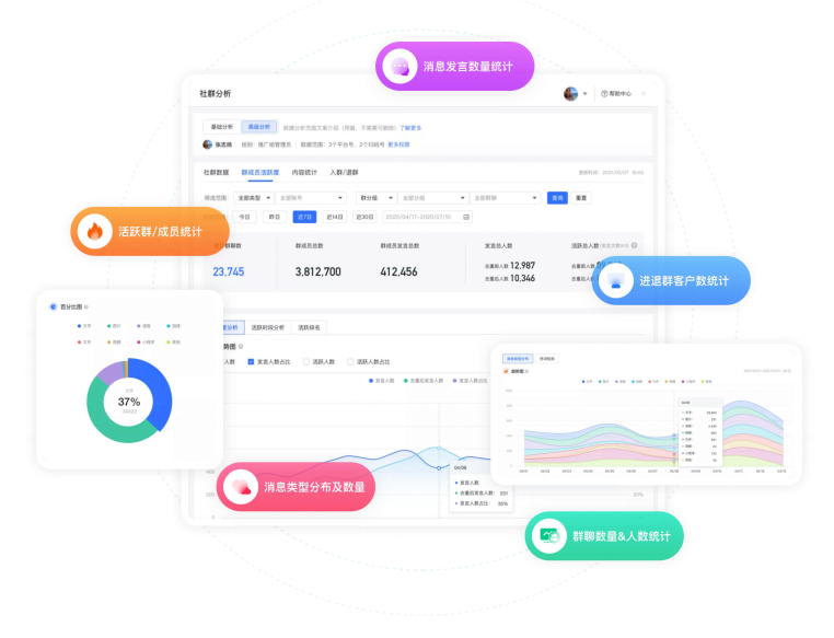 在群数据统计中,热风可以看到进退群客户数统计、群聊数量及人数统计、消息类型分布及数量、活跃群/成员统计消息发言数量统计等多项数据,有利于了解私域运营情况,并针对性进行调整。