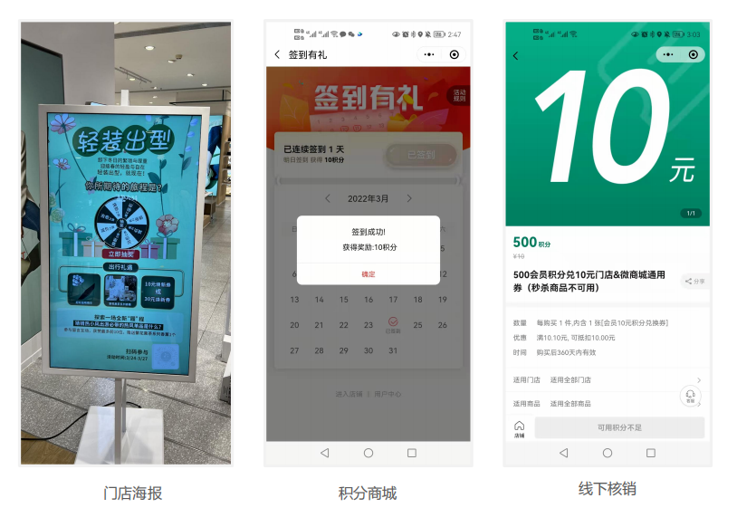 顾客可以通过签到、发言、留存等方式获得圈量群积分,积分可在圈量积分商城兑换礼券,到店进行券码核销,提升门店复购。