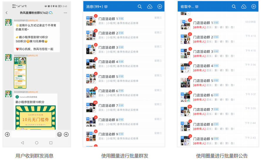 圈量智能群发和数据功能,对热风营销活动预热、推广和复盘进行了全流程支撑,助力品牌小程序商城GMV达1.8亿,回流门店客流量高达10亿 。